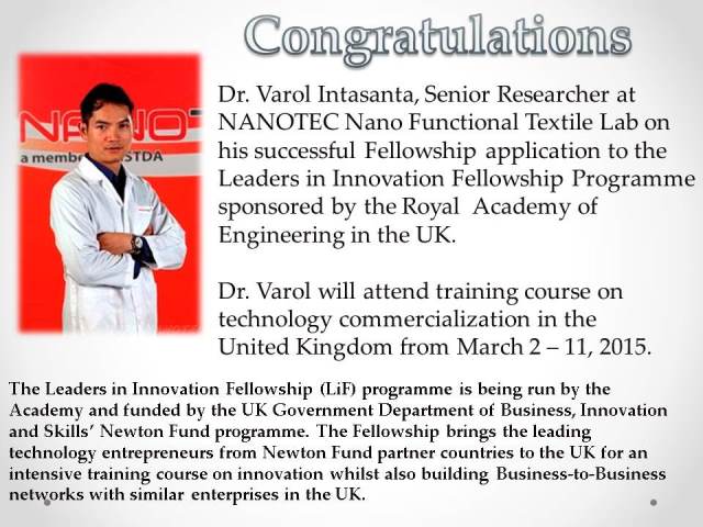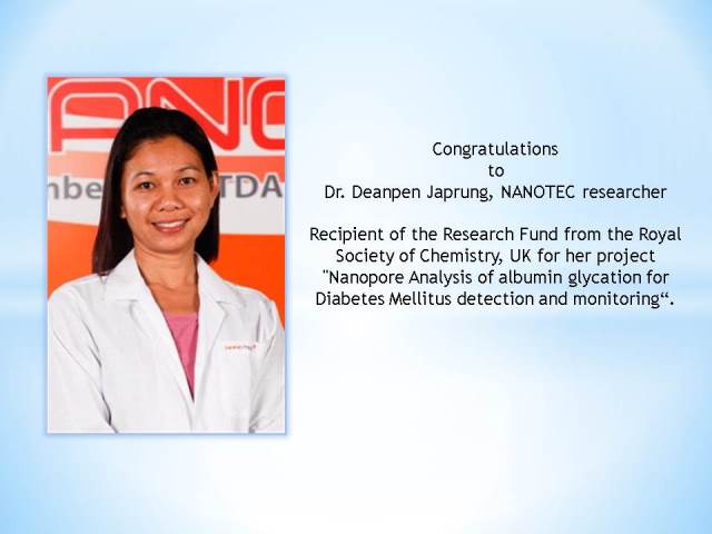 Congratulations to Dr. Sasitorn Aueviriyavit, Researcher from Nano Safety and Risk Assessment (SRA) Lab at NANOTEC who received the “NanoTOX2014 Fellowship Award”