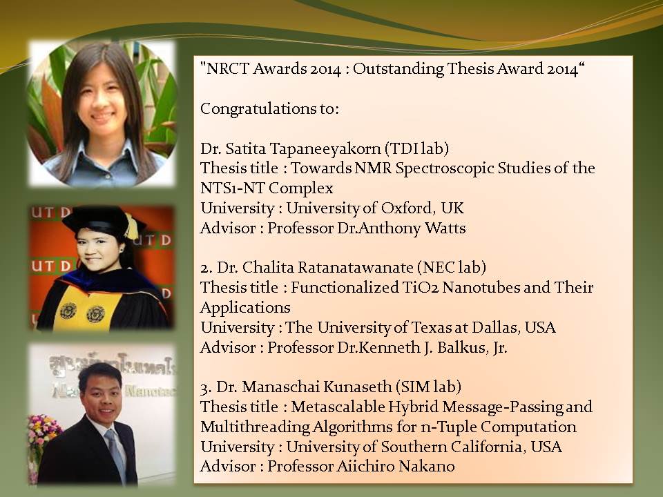Three NANOTEC researchers received the Outstanding Thesis Award 2014 this morning at Thailand Inventors’ Day 2015