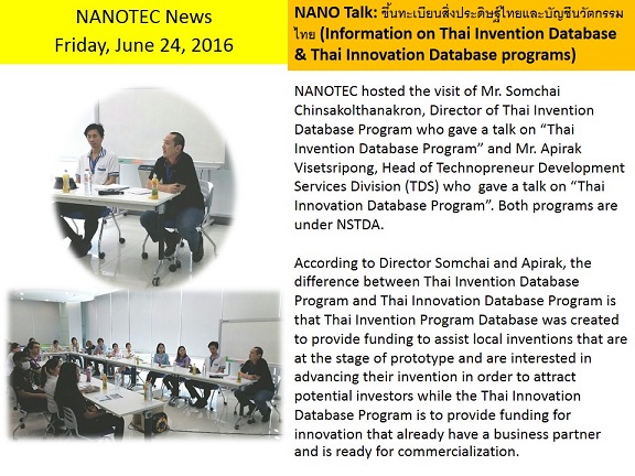 NANO Talk: ขึ้นทะเบียนสิ่งประดิษฐ์ไทยและบัญชีนวัตกรรมไทย (Information on Thai Invention Database & Thai Innovation Database programs)