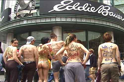 The protest group “THONG”, this week, used Street-Theater tactics on Chicago’s Michigan Avenue to draw attention to one of the first commercial nano-tech involved consumer products, a branded line of stain and water repellant clothing. Looking at the store sign, can you guess who the target market is?….