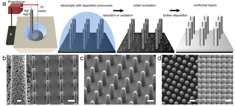 Electrodeposition can be used to construct novel functional nanowire structures hitherto impossible. This is the new finding from researchers at Harvard University in the US who have deposited conformal layers of various materials onto high-aspect-ratio silicon and micro- and nanowire arrays of different diameters, pitch, aspect ratios, shapes, resistivity and orientation. The structures produced could find use in a wide range of technology applications in chemistry, physics and medicine as well as in energy conversion and storage, sensing and bioelectronics…….