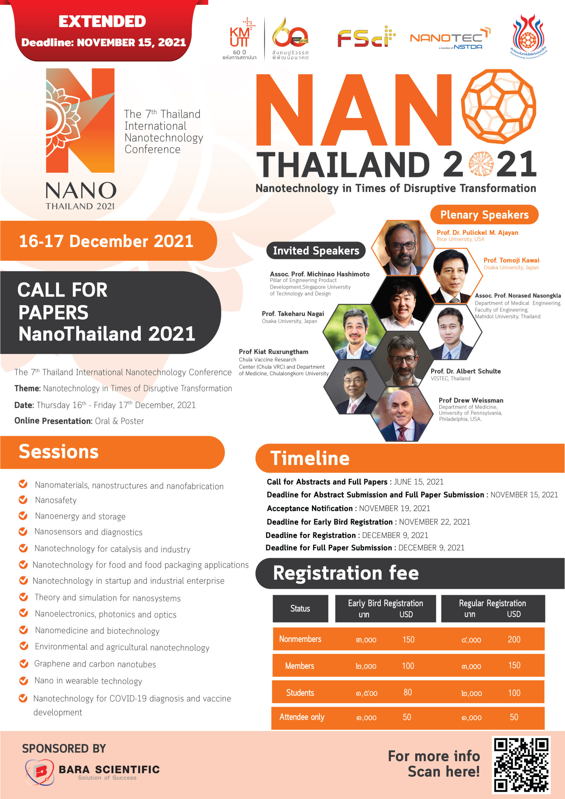 National Nanotechnology Center (NANOTEC), National Science and Technology Development Agency (NSTDA) supports the organizing of “The 7th Thailand International Nanotechnology Conference (NanoThailand 2021)” hosted by the Nanotechnology Association of Thailand and the Faculty of Science, King Mongkut’s University of Technology Thonburi under the concept of “Nanotechnology in Times and Disruptive Transformation” during 16 – 17 December 2021 via online platform. The abstract submission is extended to 15 November 2021 with new highlights added such as, the Plenary talk from Prof. Dr. Kiat Rakrungtham, Executive Director of the COVID-19 Vaccine Development Project, Vaccine Research Center, Faculty of Medicine, Chulalongkorn University and Prof. Drew Weissman from the University of Pennsylvania, in the title of “Nanotechnology in mRNA COVID-19 Vaccine” (the topic is subjected to change)