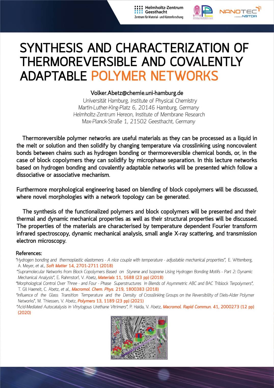 National Nanotechnology Center (NANOTEC), National Science and Technology Development Agency (NSTDA) cordially invites interested participants to attend the seminar on polymer research under the topic “SYNTHESIS AND CHARACTERIZATION OF THERMOREVERSIBLE AND COVALENTLY ADAPTABLE POLYMER NETWORKS” by Prof.Dr.Volker Abetz, Director of the Institute of Polymer Research, Helmholtz-Zentrum Geesthacht, Germany on Monday 15 November 2021 from 14.00 – 15.00 (Thailand time).