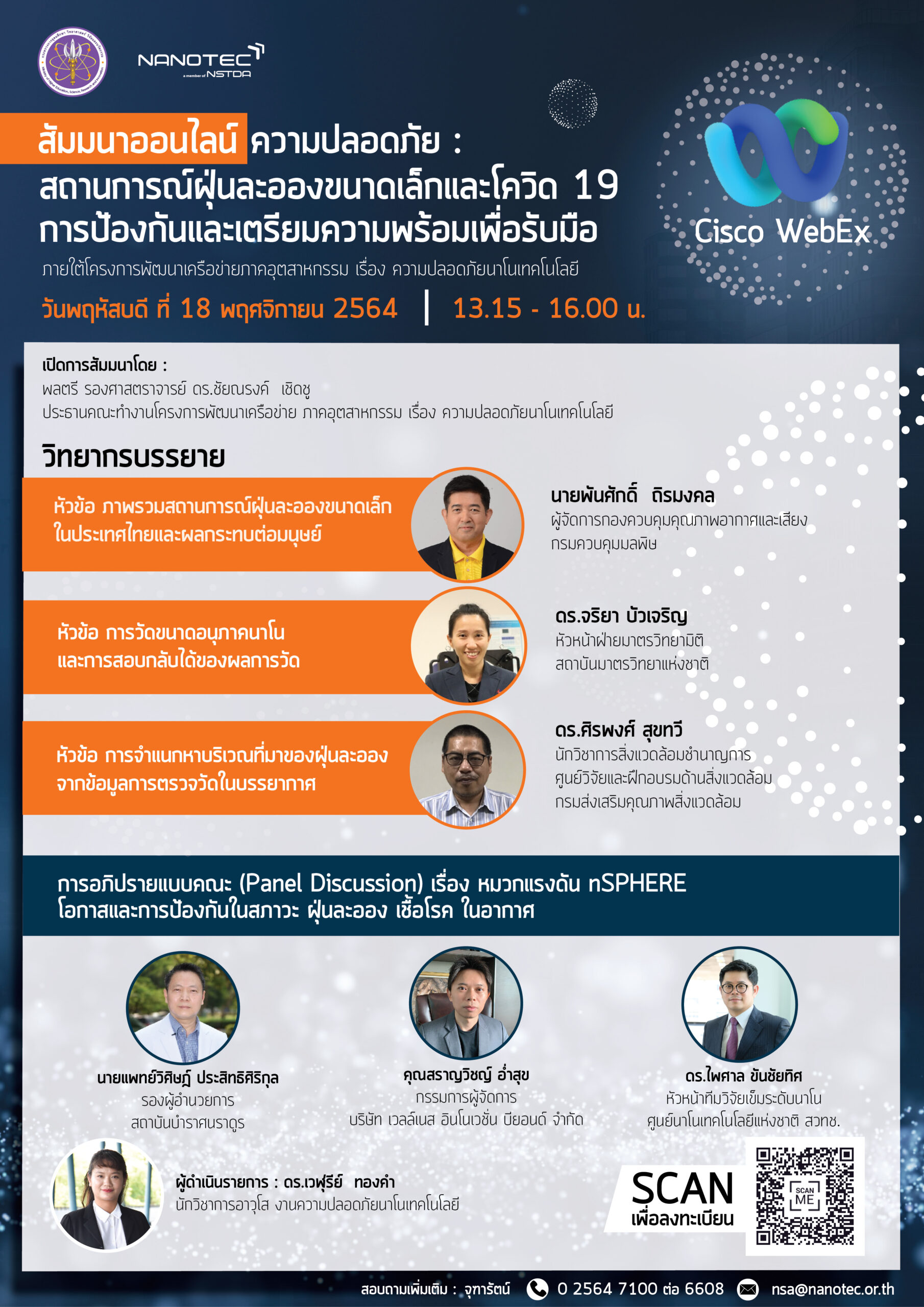National Nanotechnology Center (NANOTEC), National Science and Technology Development Agency (NSTDA) cordially invites interested participants to attend the online seminar “Safety : The situation of micro – dust and covid 19, prevention and preparation to cope” under the Industrial Network Development Project Working Group on Nano-Safety by NANOTEC, NSTDA on November 18, 2021 at 13.15 – 16.00 (Thailand Time). This seminar will be honored by Major General Assoc. Prof. Dr. Chainarong Cherdchoo, Chairman of the Industrial Network Working Group who will preside over the opening remarks of the seminar.