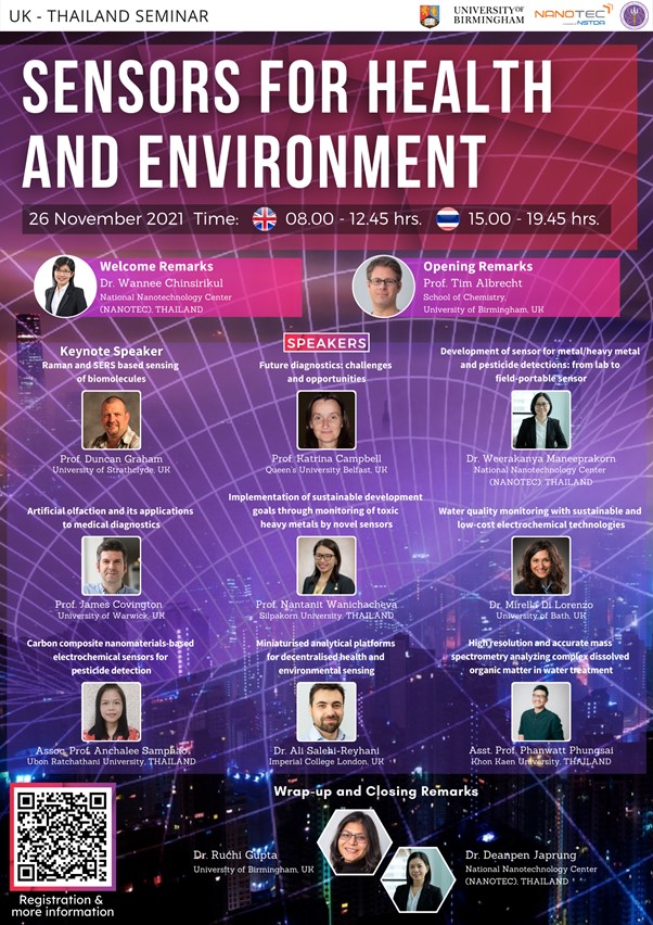 NANOTEC, Thailand in collaboration with University of Birmingham, UK cordially invite you to “UK – Thailand Seminar on Sensors for Health and Environment” which will be held on next Friday (26 November 2021) at 3 p.m. (Thailand Time) onwards via zoom meeting.
