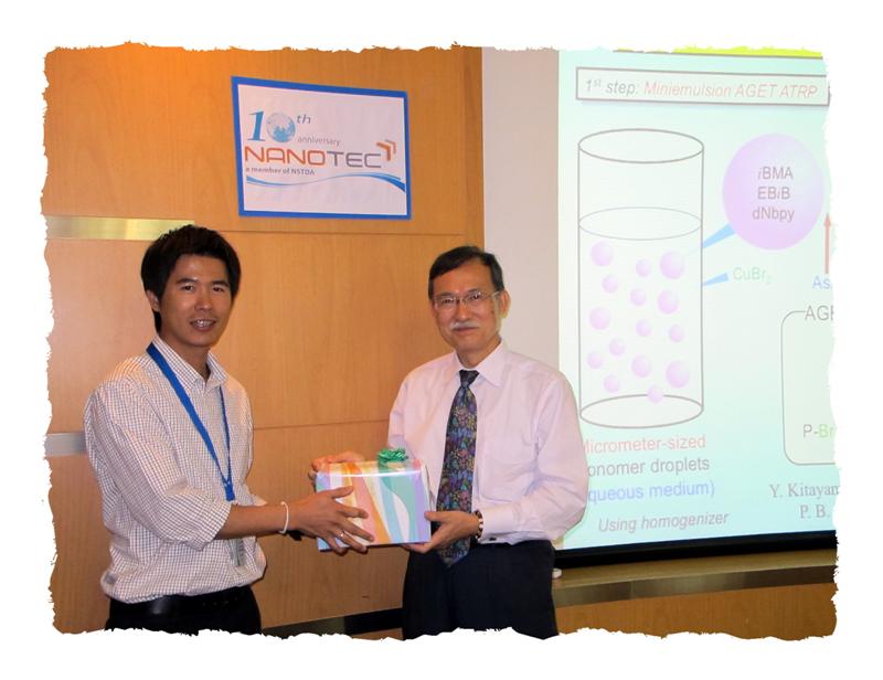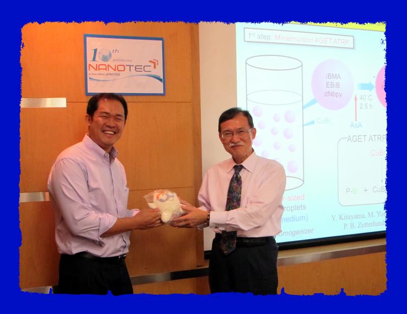 On 30 Nov 2012, NANOTEC hosted the visit of Prof. Masayoshi Okubo, Professor Emeritus, Kobe University who gave a talk on “Molecular and Particular Designs by Controlled/Living Radical Polymerization in Aqueous Dispersed Systems” to researchers and academia.
