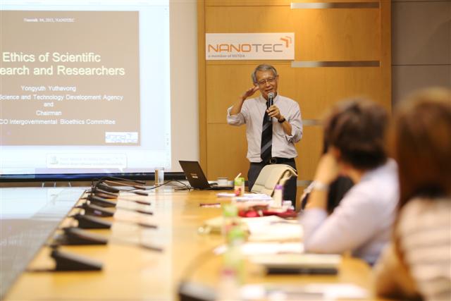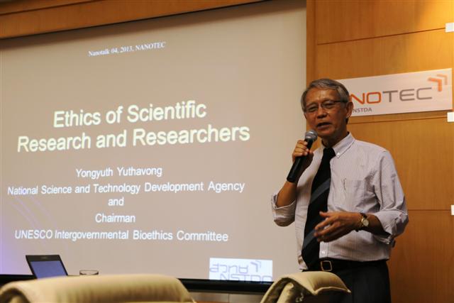 “Researchers have social responsibilities that call for honesty of profession and implication of their research work to society” said Prof. Yongyuth Yuthavong during his keynote talk at NANOTEC’s NANO Talk session. “These responsibilities extend to the way they do their research, how they report their research findings, and awareness to potential dangers and benefits”.