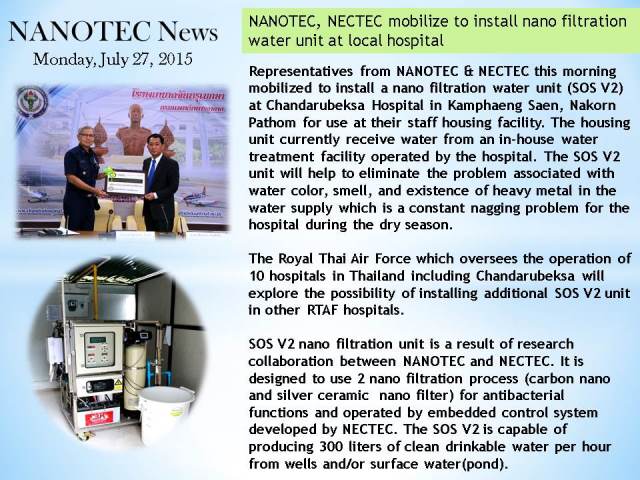 NANOTEC, NECTEC mobilize to install nano filtration water unit at local hospital
