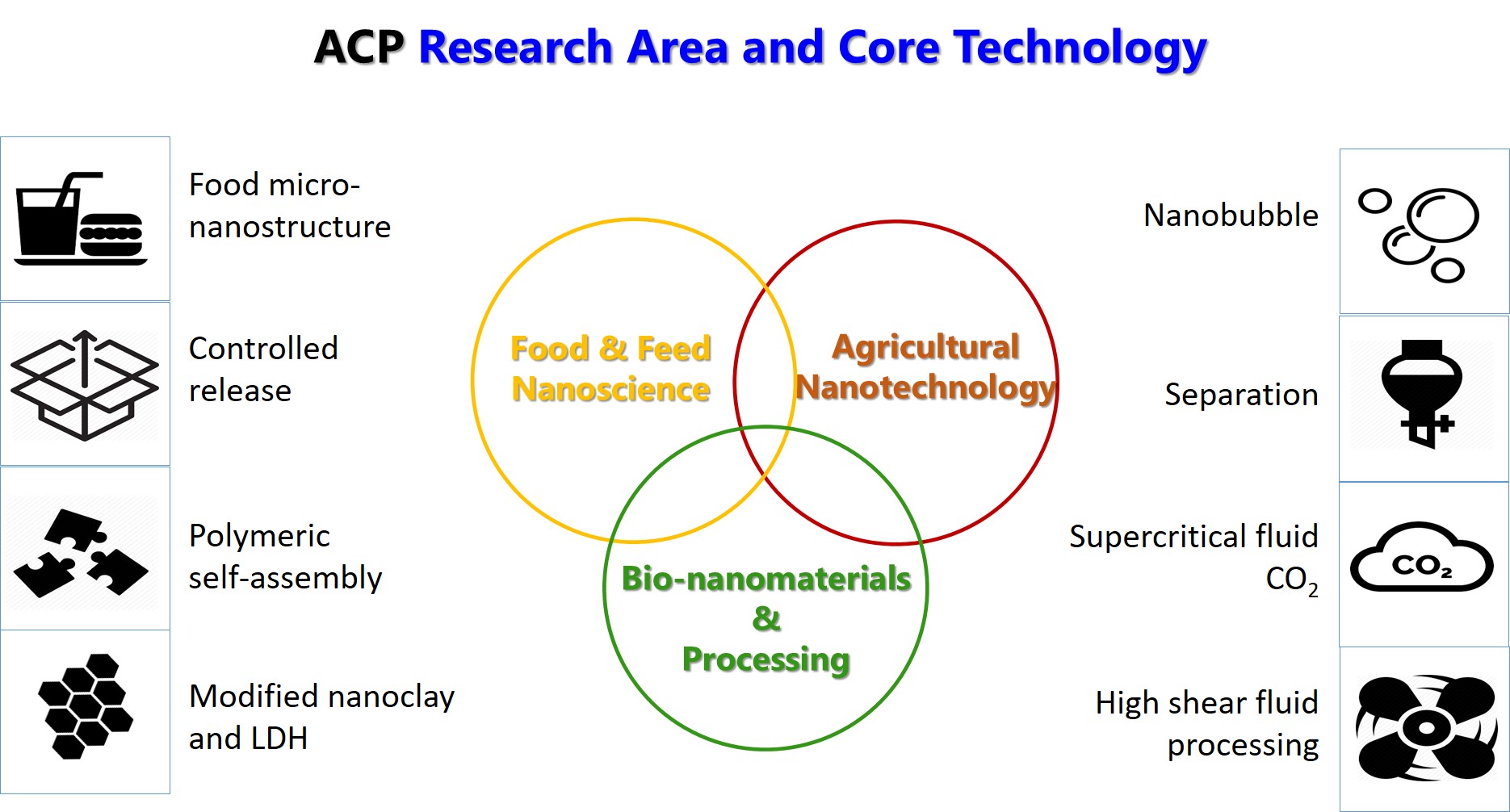 ACP research team focuses on the technology development for novelties in food, feed, and agricultural products using multi-disciplinary backgrounds. The employed expertise from our research team members encompasses nano-chemistry, biotechnology, food science, agriculture, nano-engineering, and inorganic nanomaterials/composite to gain better knowledge and enhance national competitiveness. We emphasize on value creation of agricultural products and by-products from agro industry. This is to strengthen the food security of country at global level.